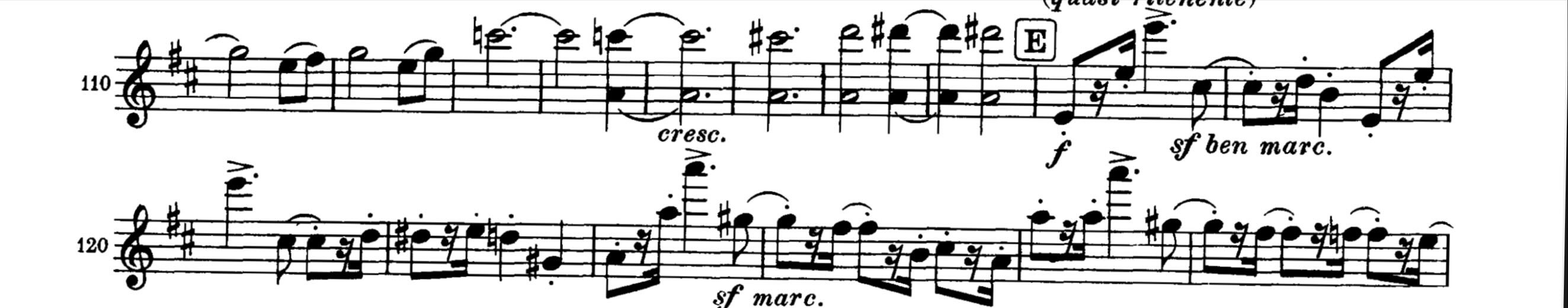 Then, at rehearsal E (m. 118), we get the “ballistic” movement on the accented dotted quarter notes and tied notes that follow: